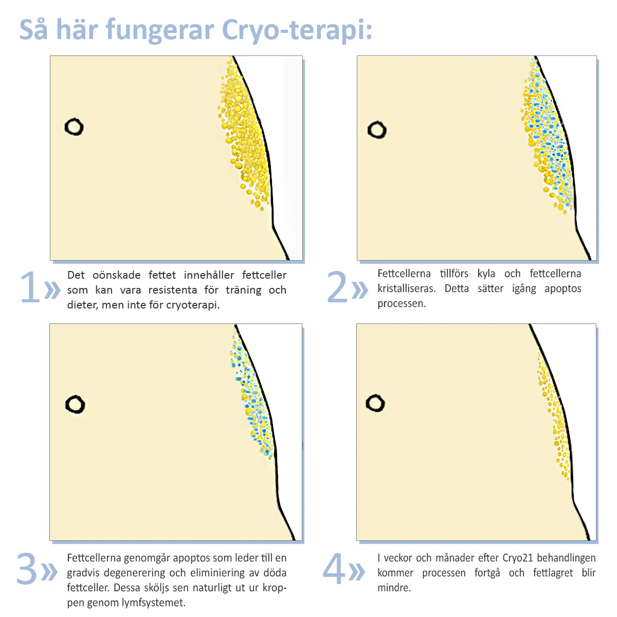 (Cryotherapy) er FDA/CE-godkjent og godkjent av American Academy of Cosmetic Surgery. Behandlingen er helt trygg og ufarlig – uten noen form for bivirkninger. Behandlingen føles som en kjølig, men behagelig massasje.